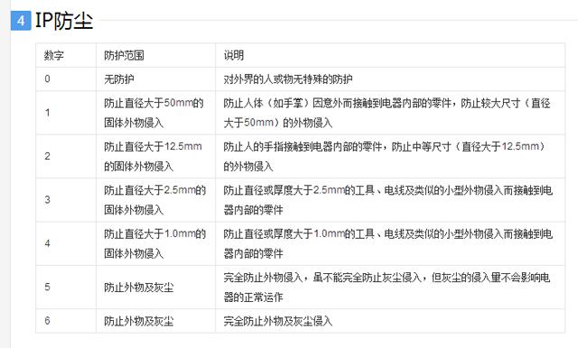 在這個(gè)標(biāo)準(zhǔn)中,針對(duì)電氣設(shè)備外殼對(duì)異物的防護(hù),IP等級(jí)的格式為IPXX,其中XX為兩個(gè)阿拉伯?dāng)?shù)字,第一標(biāo)記數(shù)字表示接觸保護(hù)和外來(lái)物保護(hù)等級(jí),第二標(biāo)記數(shù)字表示防水保護(hù)等級(jí),具體的防護(hù)等級(jí)可以參考下面的表格。